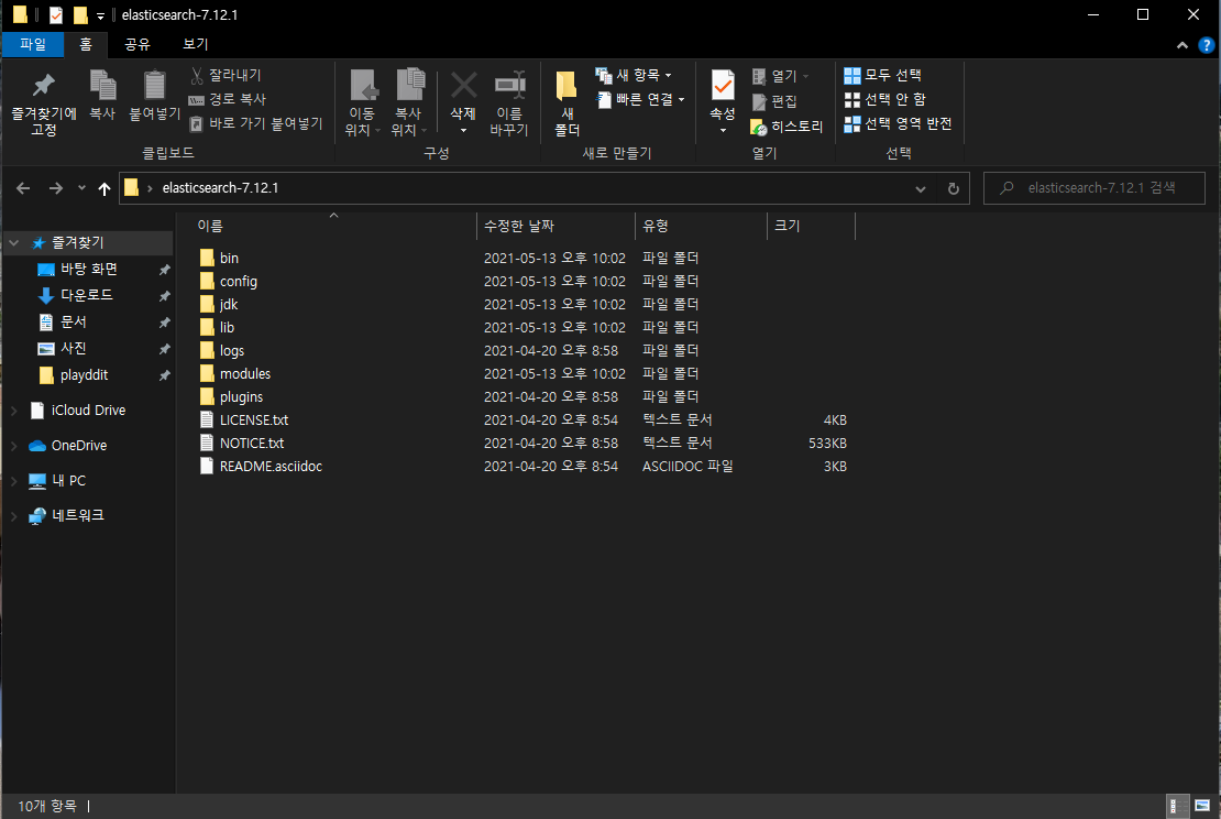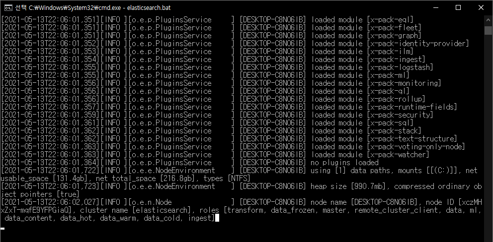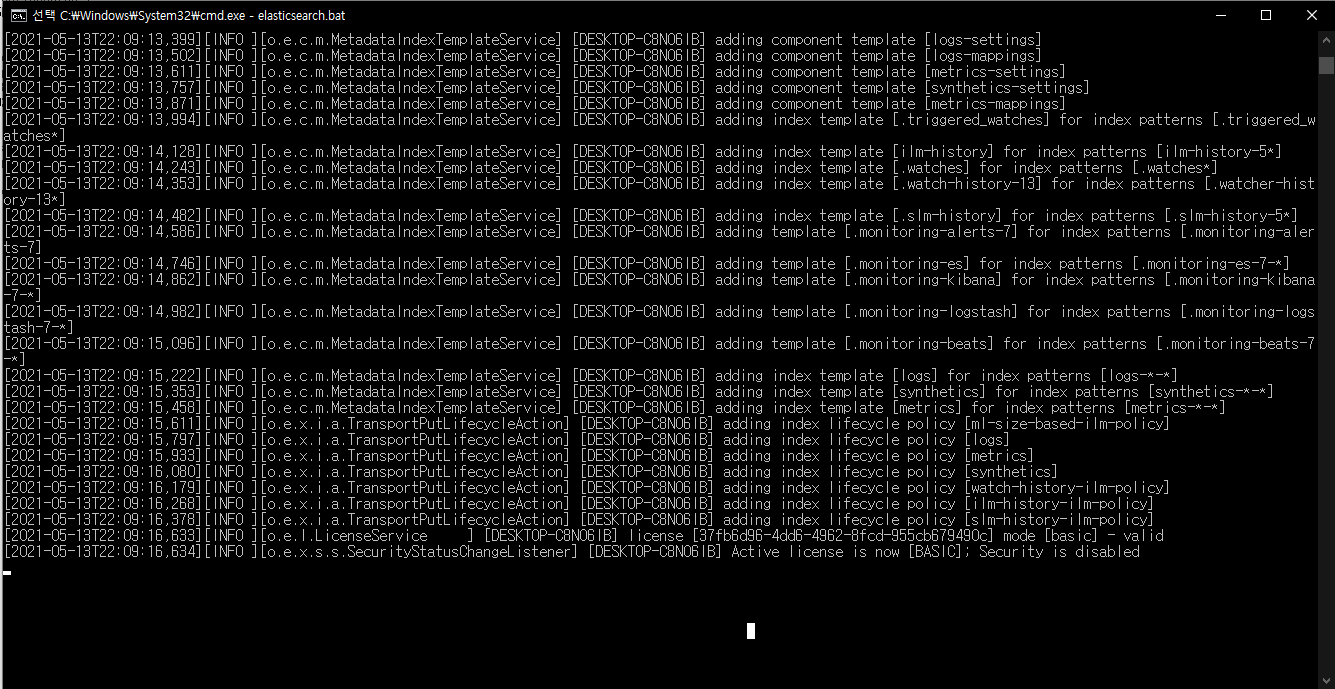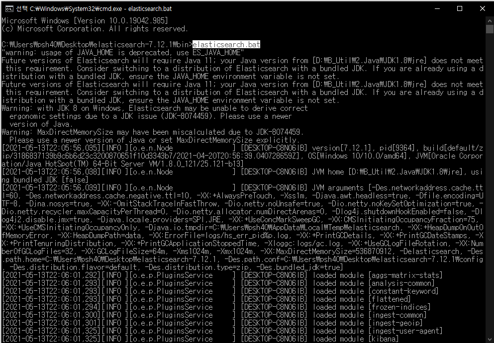 다짜고짜 일단 elasticsearch.bat 파일을 실행해 보았습니다.