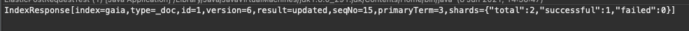 IndexResponse[index=gaia,type=_doc,id=1,version=6,result=updated,seqNo=15,primaryTerm=3,shards={"total":2,"successful":1,"failed":0}]