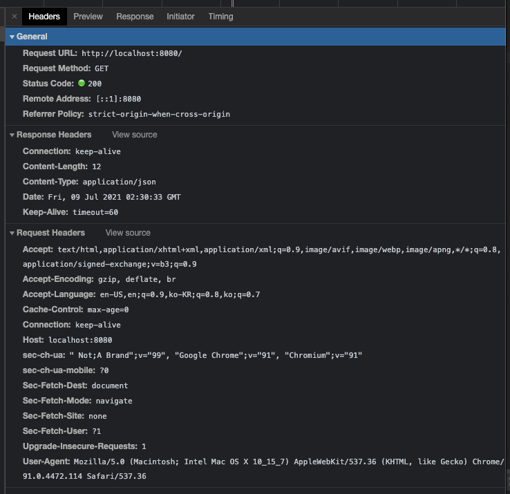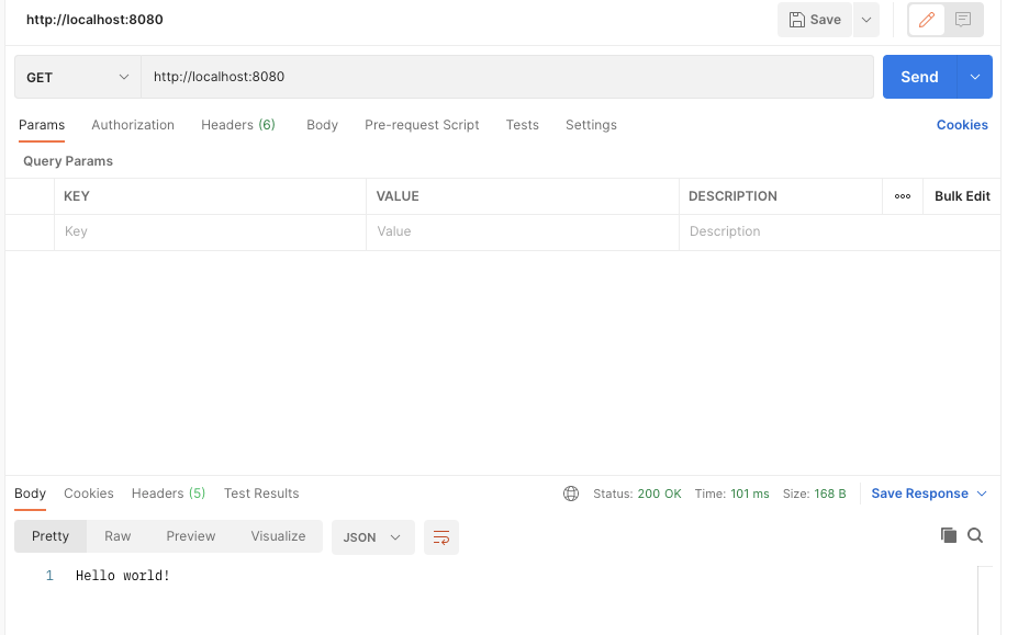 POSTMAN을 활용해서 요청을 보냈고, Hello world! 라는 JSON 데이터를 받은 것을 확인 할 수 있습니다.