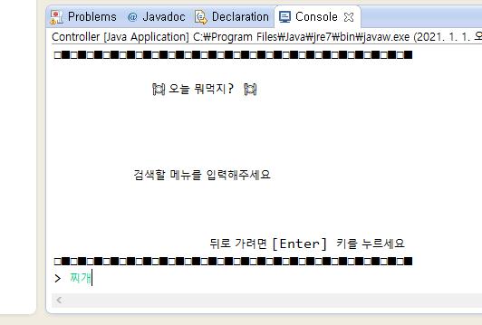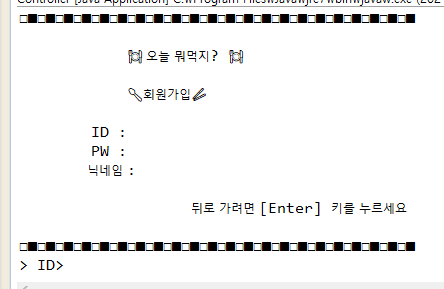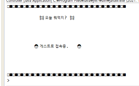 static public void loading(){ String[] str = {"ㅇ_","오_","온_","오느_","오늘_","오늘 _","오늘 ㅜ_","오늘 ㅝ_","오늘 ㅜ_","오늘 _","오늘 ㅁ_","오늘 무_","오늘 뭐_","오늘 뭐 ㅁ_","오늘 뭐 머_","오늘 뭐 먹_" ,"오늘 뭐 먹ㅈ_","오늘 뭐 먹지_","오늘 뭐 먹지_","오늘 뭐 먹지._","오늘 뭐 먹지.._","오늘 뭐 먹지..._","오늘 뭐 먹지...? "}; String[] name1 = {"👨 ㅂ_","👨 바_","👨 박_","👨 밗_","👨 박세_","👨 박셓_","👨 박세혀_","👨 박세현"}; String[] name2 = {"👩 ㅇ_","👩 유_","👩 윤_","👩 윥_","👩 윤지_","👩 윤짛_","👩 윤지혜"}; String[] name3 = {"👦 ㅈ_","👦 저_","👦 정_","👦 정ㅇ_","👦 정이_","👦 정잇_","👦 정이사_", "👦 정이삭_","👦 정이삭_","👦 정이삭","👦 정이삭","👦 정이삭_","👦 정이삭_","👦 정이삭","👦 정이삭","👦 정이삭_","👦 정이삭_","👦 정이삭"}; int n1=0 ,n2=0, n3=0; String pressEnter = ""; String eyes = " • _ •│ "; for(int i=0; i<str.length+name1.length+name2.length+name3.length; i++){ String str_1 = "",name_1="",name_2 = "", name_3 = ""; int j=i; if(j>str.length-1) j=str.length-1; str_1 = str[j]; if(i>= str.length){ if(n1>name1.length-1) n1=name1.length-1; name_1 = name1[n1++]; } if(i>= str.length+name1.length){ if(n2>name2.length-1) n2=name2.length-1; name_2 = name2[n2++]; } if(i>= str.length+name1.length+name2.length){ if(n3>name3.length-1) n3=name3.length-1; name_3 = name3[n3++]; } if(i==str.length+name1.length+name2.length+name3.length-1){ Util.wait(200); eyes = " > _ <│ "; pressEnter = " 계속하려면 엔터키를 입력..."; } Util.wait(150); System.out.println("\n\n\n□■□■□■□■□■□■□■□■□■□■□■□■□■□■□■□■□■□■□■□■□■□■"); System.out.println(); System.out.println(); System.out.println(" ╭∂∂∂∂∂∂╮ ╭──────────────╮ "); System.out.println(" ε"+eyes+str_1); System.out.println(" ╰──┰┰──╯ ╰──────────────╯ "); System.out.println(" ╭──╲╱──╮"); System.out.println(" ╞══╧══════╧═════════╡▒ "+name_1); System.out.println(" │ 대덕인재개발원 302호 │▒ "+name_2); System.out.println(" └───────────────────┘▒ "+name_3); System.out.println(" ▒▒▒▒▒▒▒▒▒▒▒▒▒▒▒▒▒▒▒▒▒▒ "); System.out.println(); System.out.print("□■□■□■□■□■□■□■□■□■□■□■□■□■□■□■□■□■□■□■□■□■□■\n>"+pressEnter); } ScanUtil.nextLine(); }