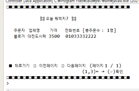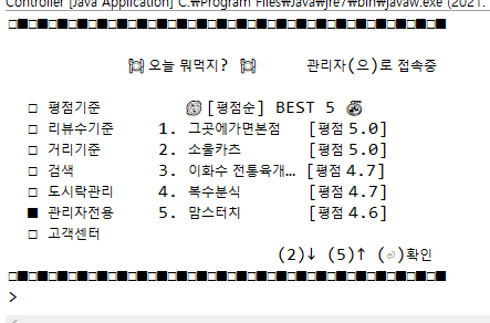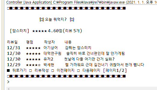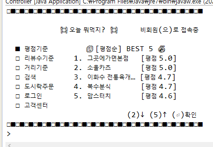 처음 프로그램을 시작하면 학원 근처의 식당들을 평점순, 리뷰수순, 거리순으로 바로바로 정리해줍니다. 메인 화면의 구성은 jeje의 아이디어였는데, 막상 구현해놓고 나니 크게 어렵지 않고 만족도도 컸습니다.