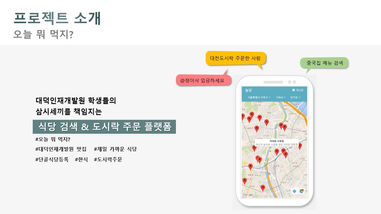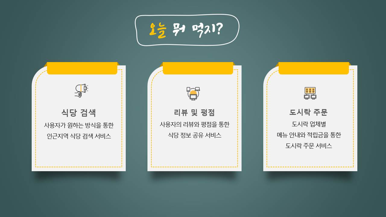 특정한 메뉴가 먹고 싶은 날이 있는데 간단하게 그 메뉴의 이름만 입력하면 그 메뉴를 포함한 모든 식당들의 목록이 나온다니 제가 생각해도 좋은 기능입니다.